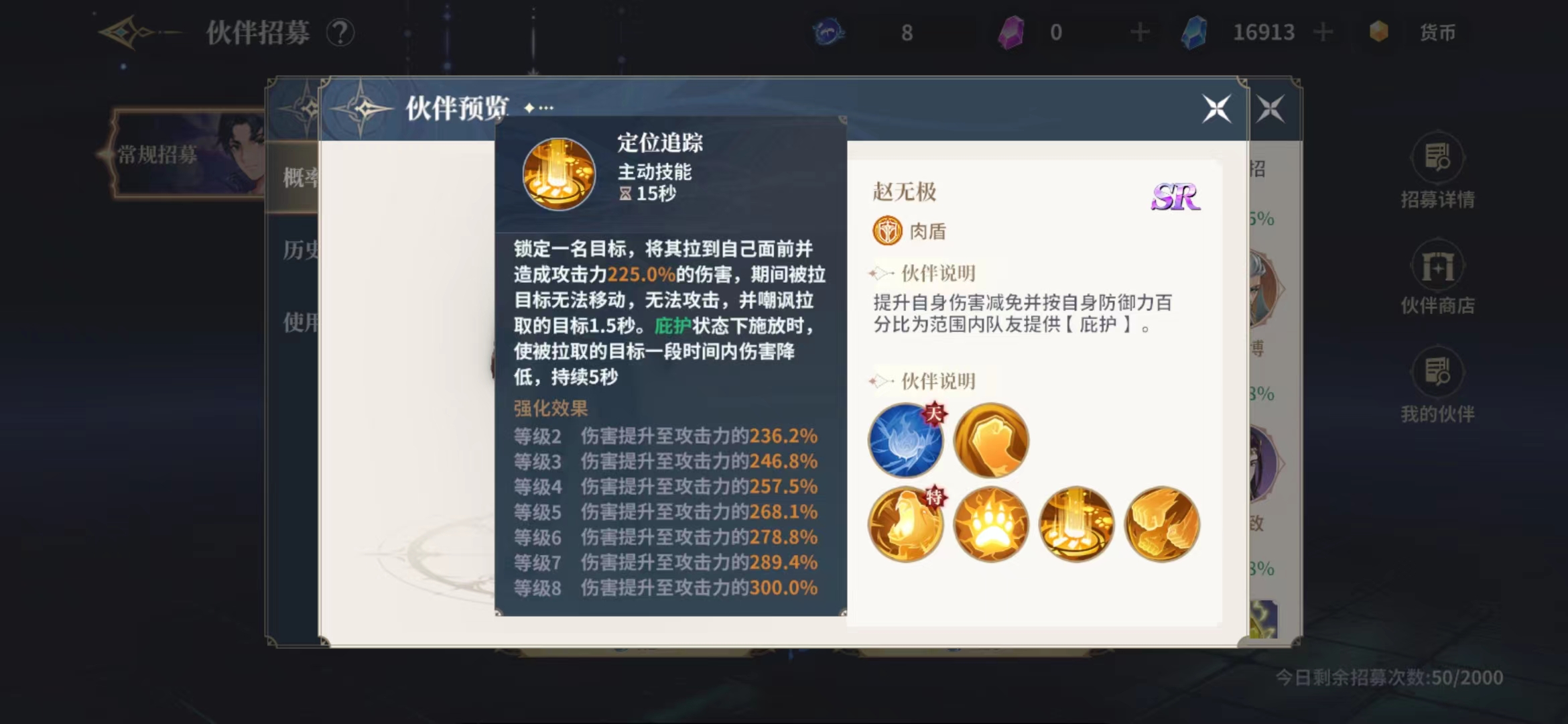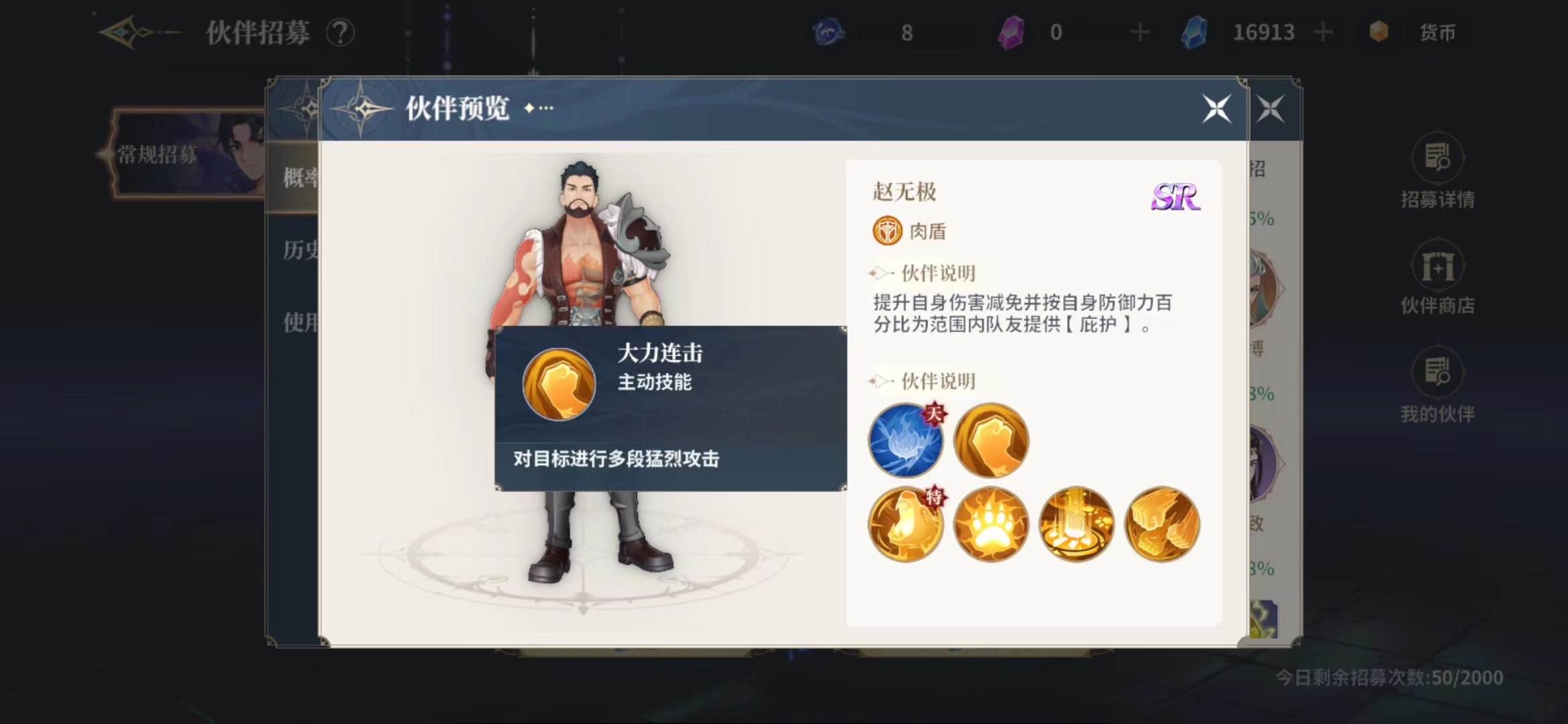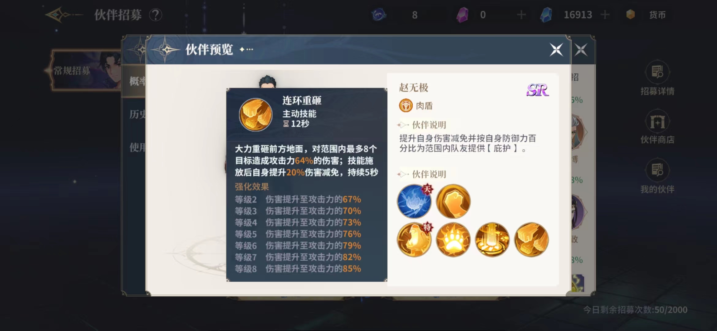 最后一个技能连环重击是一个群攻技能,使用之后角色会大力重砸前方地面,对前方范围之内最多8个目标造成攻击力64%的伤害,技能使用之后自身也会提升20%伤害减免,这个免伤在关键时刻也是能够救命的,不过持续的时间不算长,只有5秒时间有效,所以还是需要搭配治疗角色使用,但是在提升伙伴等级之后在输出效果上面会有大量百分比的提升,这个时候的赵无极还是有一定输出的,否则一般情况下赵无极是只能当做护盾使用的。