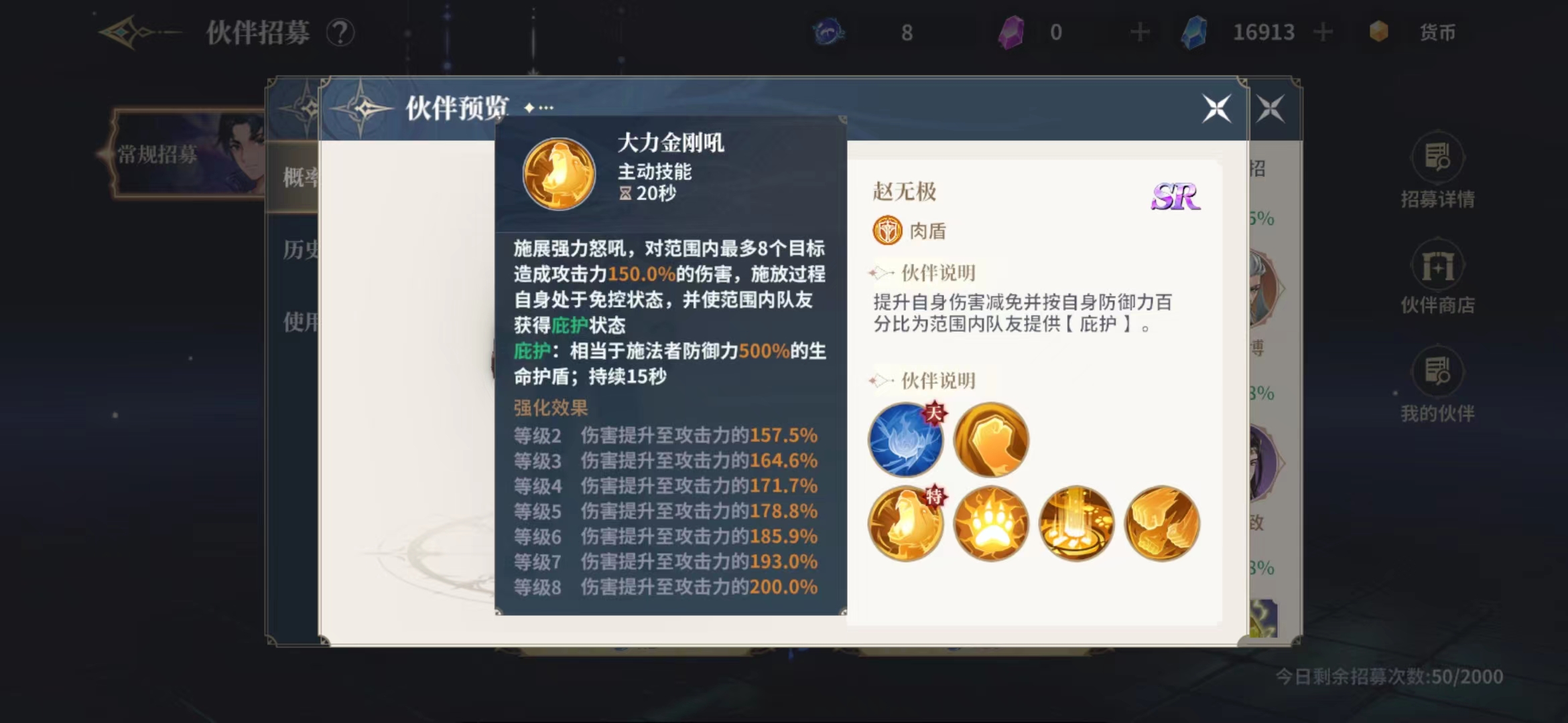 大力金刚吼这个技能就是一个带有高输出的技能,使用这个技能的时候赵无极会施展强力怒吼,对范围内最多8个目标造成攻击力150.0%的伤害,释放技能的过程中自己是处于免控状态,也就是说敌人并不能控制住赵无极,而且也打断不了这个技能,在输出的同时技能效果还可以使范围内队友获得庇护状态,这个状态就是 相当于施法者防御力500%的生命护盾,这样一个护盾起码是可以帮助脆皮多挡几次对面技能的,而且护盾的持续时间也不短,有15秒的有效时间。