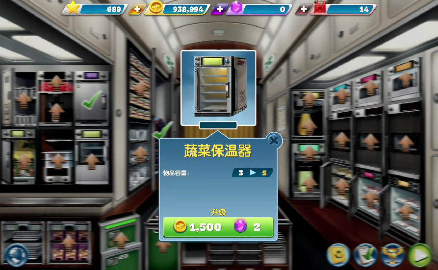 想要解决食物温度散热较快的问题,可就要购买一些加热食物的加热器以及让食物保持恒温的保温器。游戏中有很多的保温器,例如肉馅饼保温器,牛排保温器,即一个保温器只能保护一种食物的温度,而想要蔬菜保持恒温就要购买蔬菜保温器,因为蔬菜的降温是比较快的,如果温度没有达到顾客的需求,顾客可能不会支付蔬菜的价格,有了蔬菜保温器就不怕蔬菜类的食物没有温度了。