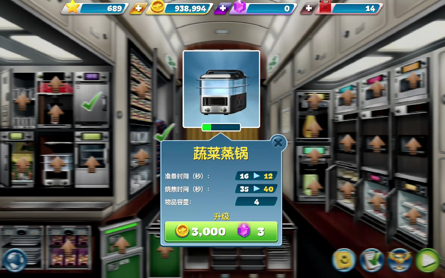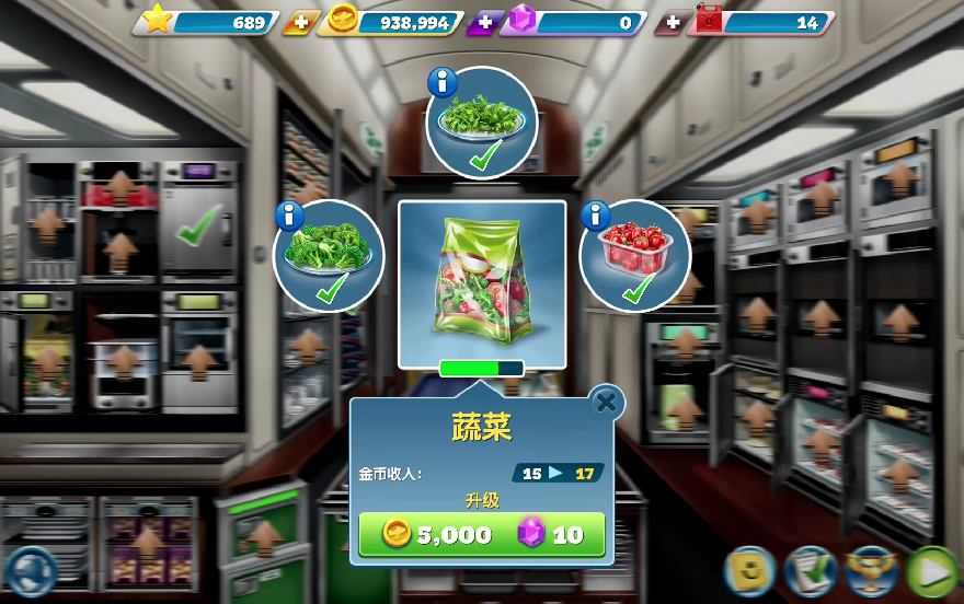 最高等级的蔬菜保温器有5层,能一起容纳5份蔬菜佳肴,这是升级后容量。在悉尼机场的前几关服务的顾客不是很多,这几份出锅后就能立即交给顾客,所以蔬菜也就不需要保温了,在游戏后期顾客要求会更加的复杂,有的顾客是不吃冷的食物,这时就要借助保温器的力量。