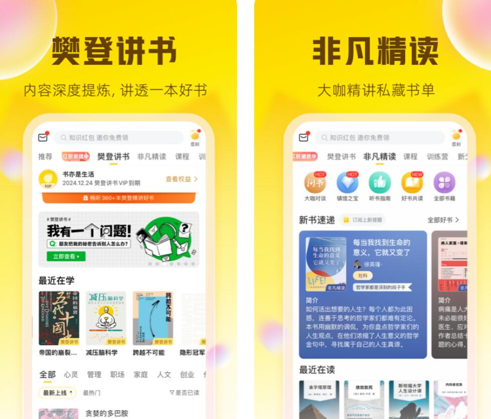 软件当中包含的书籍都比较实用,大家可以从中,学到许多有用的常识。如果你平常的读书时间不太多,但你还想快速看懂一本书,那么可以听听一些业内大咖的讲解,他们会由浅入深地为你讲授书中的精华。此外,还有很多质量颇高的书籍配套课程,供各位去选择。