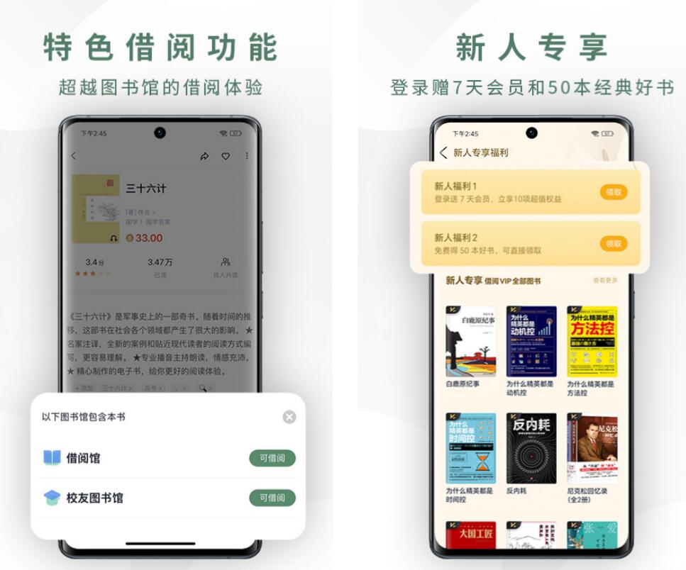 用户注册登录好这个软件后,就会收到平台免费赠送的数十本图书,让使用者直接开启阅读之旅。软件独有的借阅功能,大家如果有喜欢的书籍,那么无需自费购买,可以到共享图书馆中先看看,要是存在的话,可以直接借来阅读,现在共享书库中包含了上百万本电子书,包含了大多数类型。