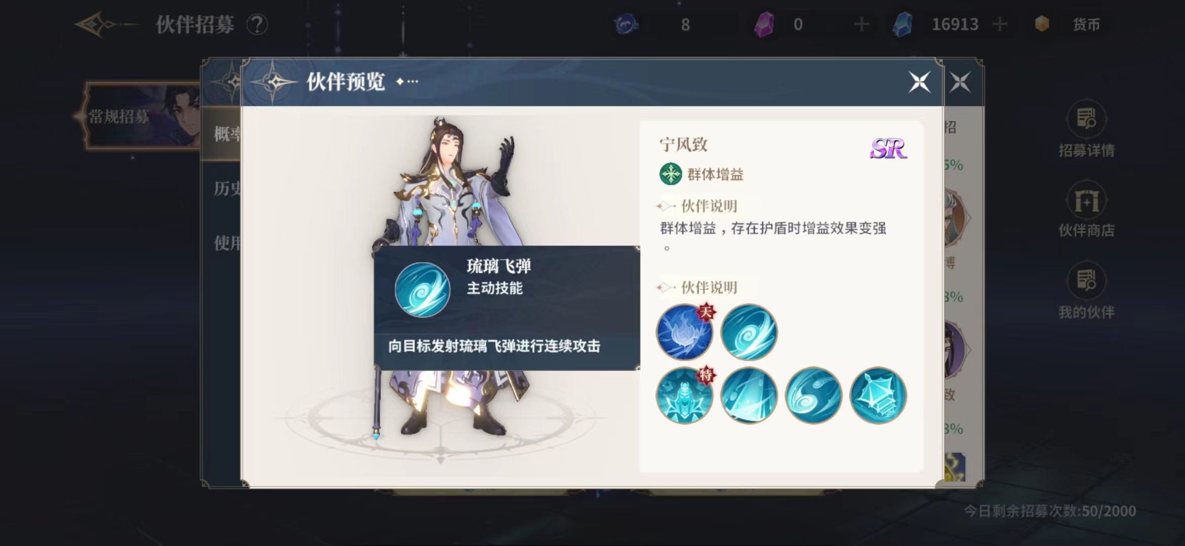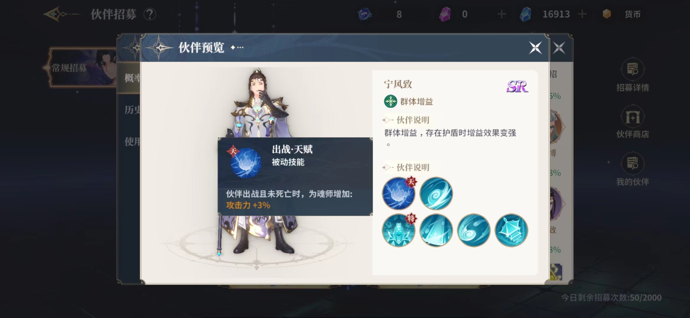 宁风致这个伙伴的技能朱啊哟用处其实也是在与群体增益上面,在出战天赋上面带来的效果是为魂师增加攻击力3%的效果,只要宁风致在场上没有被击杀,这个增益效果就是一直存在的,因为主要是给群体带来增益效果的技能,所以只要队伍里面存在护盾那么和这个增益的效果效果就会变强,在普攻上面是没有强化效果的,使用普攻琉璃飞弹可以向目标发射出飞弹进行连续攻击,大家可以当做一个连击技能使用,但是输出上面的数值不能要求太高。