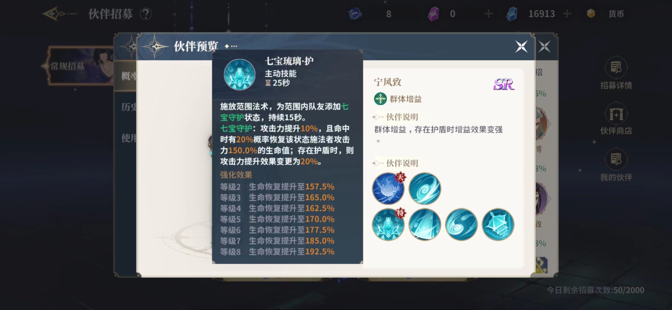 而七宝琉璃护这个技能则是考虑搭配施放范围的,因为这个法术技能会对范围中的成员生效,使用之后会为范围内队友添加七宝守护状态,七宝守护状态会给成员带来攻击力提升10%的效果,且在命中敌人的时候有20%概率恢复该状态施法者,也就是宁风致攻击力150.0%的生命值,要是攻击的同时身上还存在护盾时,则攻击力提升效果变更为20%,这个增加 七宝琉璃护技能是可以持续15秒时间有效的,所以大家一定要看准成员最多的区域释放这个技能。