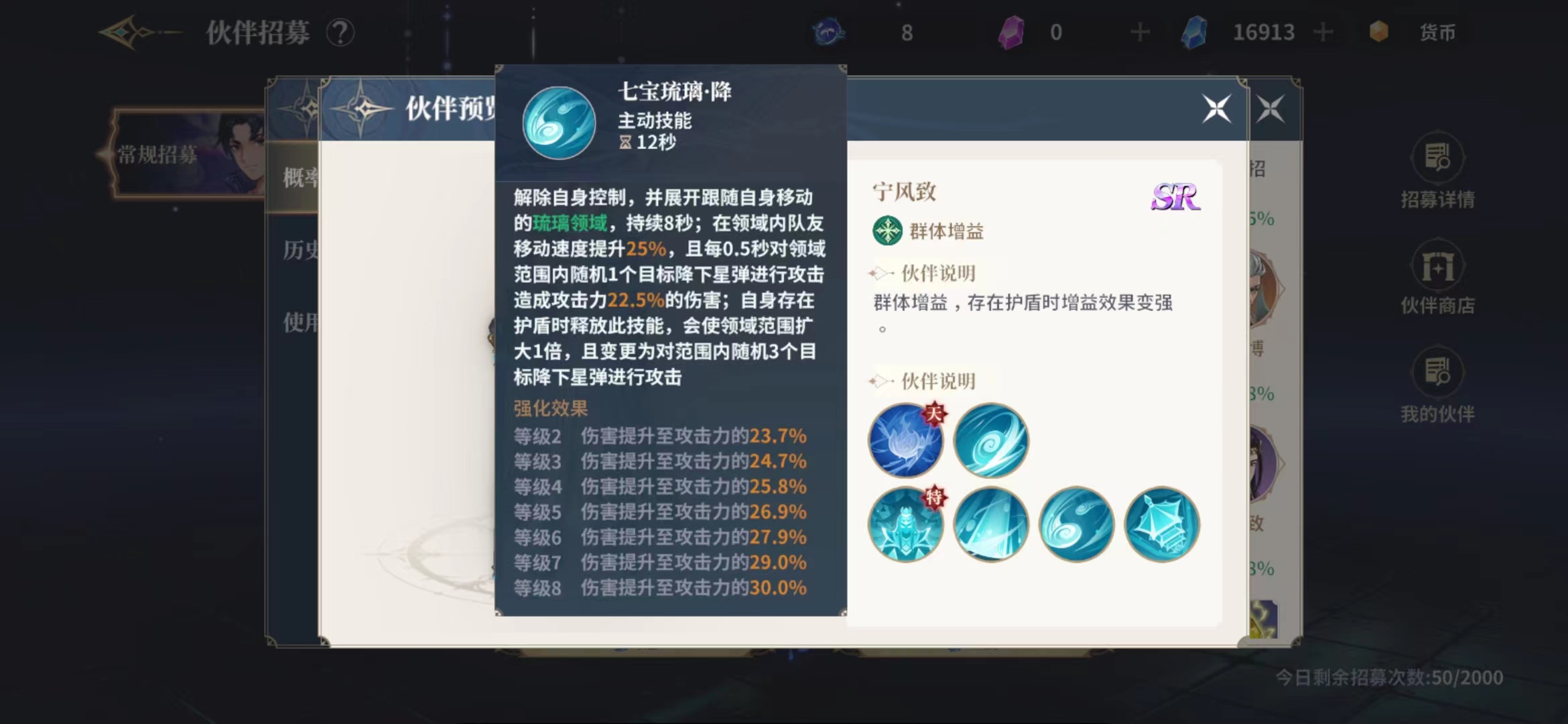 七宝琉璃降这个技能是可以解除自身控制的,大家在受到对面负面状态影响的时候就可以使用这个技能,使用的时候会展开跟随自身移动的琉璃领域,持续8秒时间内只要是在领域内的队友在移动速度上都会提升25%,而且每0.5秒对领域范围内随机1个目标带来星弹攻击,星弹攻击会造成攻击力22.5%的伤害,这个时候要是角色身上有护盾时,释放的技能领域范围会扩大原来的1倍,且变更为对范围内随机3个目标降下星弹进行攻击,攻击数值随着宁风致等级的变化而提升。