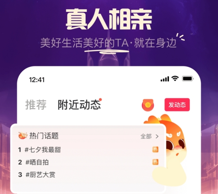 一个可以交友、相亲的软件。能加好友一起聊,点歌一起听,游戏一起玩,如果离得近,还可以见面认识认识,也是款能帮助脱单的app。有新鲜事可以发动态,在附近动态界面还可以看每日热门话题。