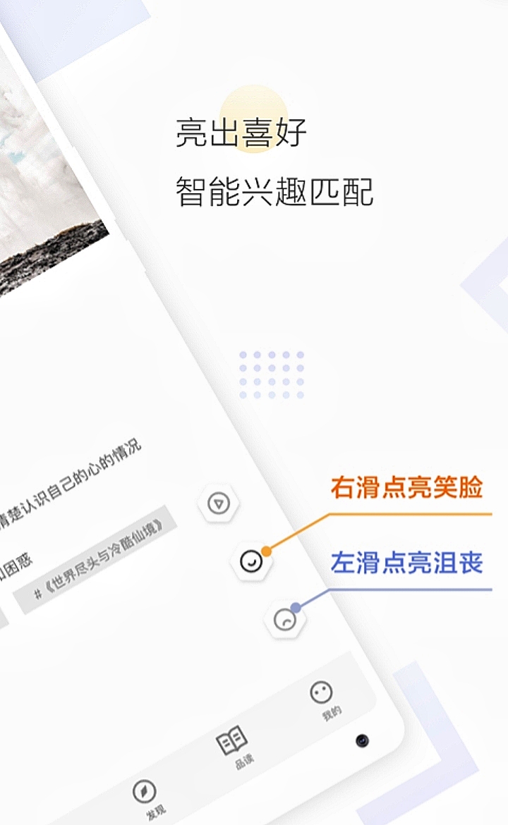 软件交友方式很新颖,通过兴趣来匹配好友。里面有许多关于小说、电影、音乐等内容的卡片,大家喜欢的可以左滑点亮笑脸,不感兴趣的右滑点亮沮丧,以此来匹配到与自己趣味相投的人一起聊天。