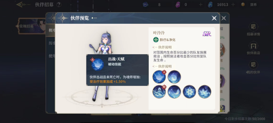 叶泠泠是一个自带了治疗的sr伙伴,在技能上面也有一定的净化效果,所以大家在组队过一些带有毒素隐形的副本,就可以带上这个伙伴,出战天赋是跟这个伙伴的主要用途有关的,在上面叶泠泠在出战的时候会带来治疗效果加成1.5%的数值,这样搭配她本身带来的治疗技能,可以帮助队伍提升一部分的生存时间,就是影响的数值不算很高。