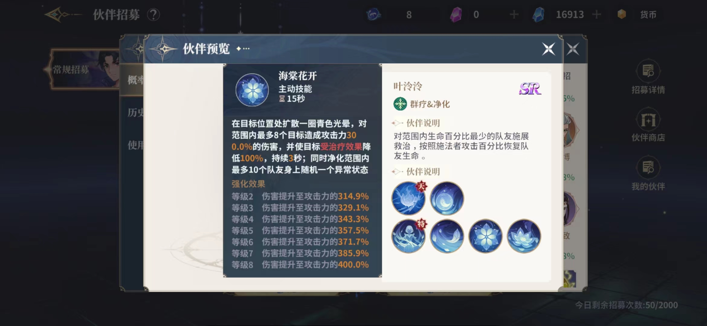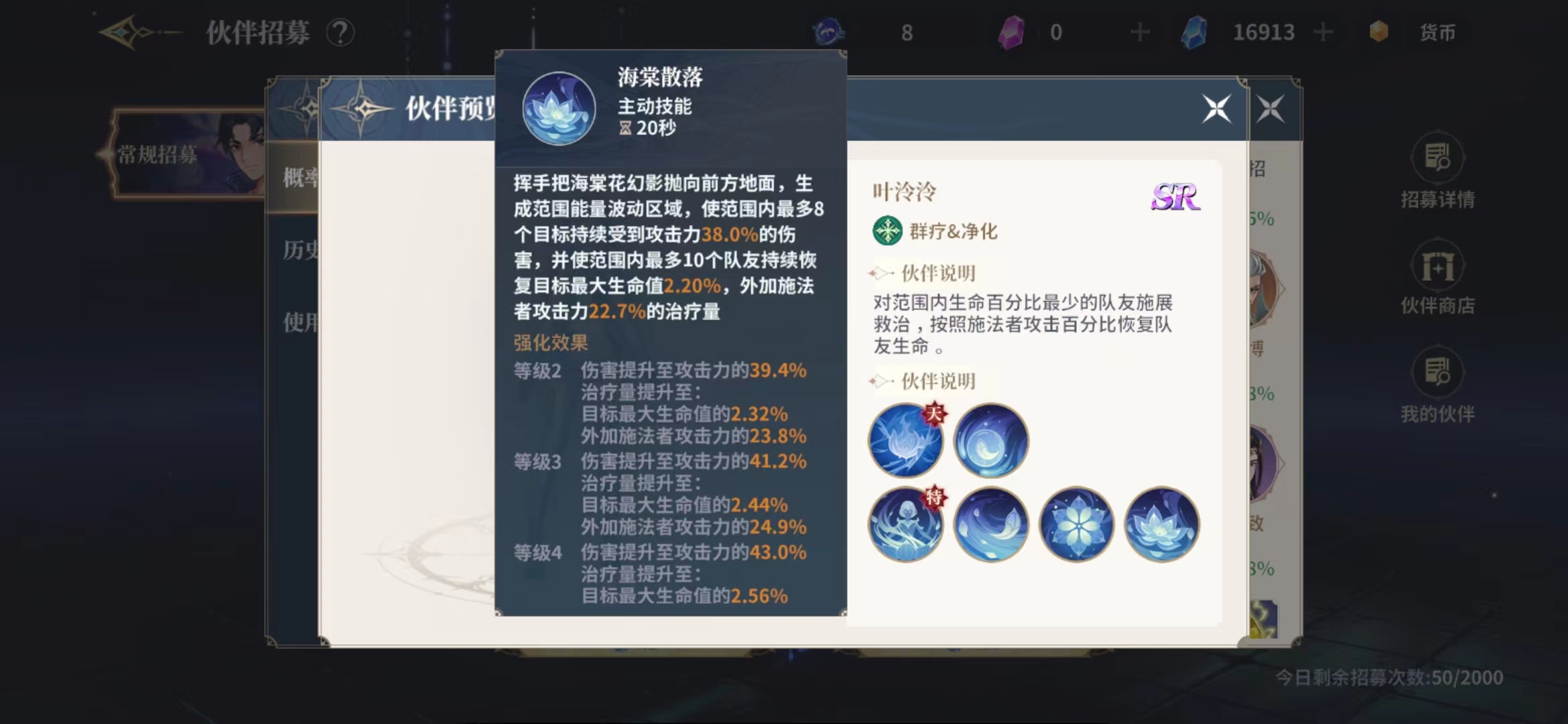 最后一个技能是海棠散落,这个技能是可以带来38%的攻击,也是一个群体攻击最多可以锁定8个目标,带来输出的时候还可以让己方最多10名队友受到生命值2.2%的恢复,加上叶泠泠的攻击22.7%生命恢复,虽然回血的数值是最低的,但是既可以攻击又可以治疗,使用的场合是很多的,后期在升级伙伴等级之后带来的百分比都会有所提升哦。