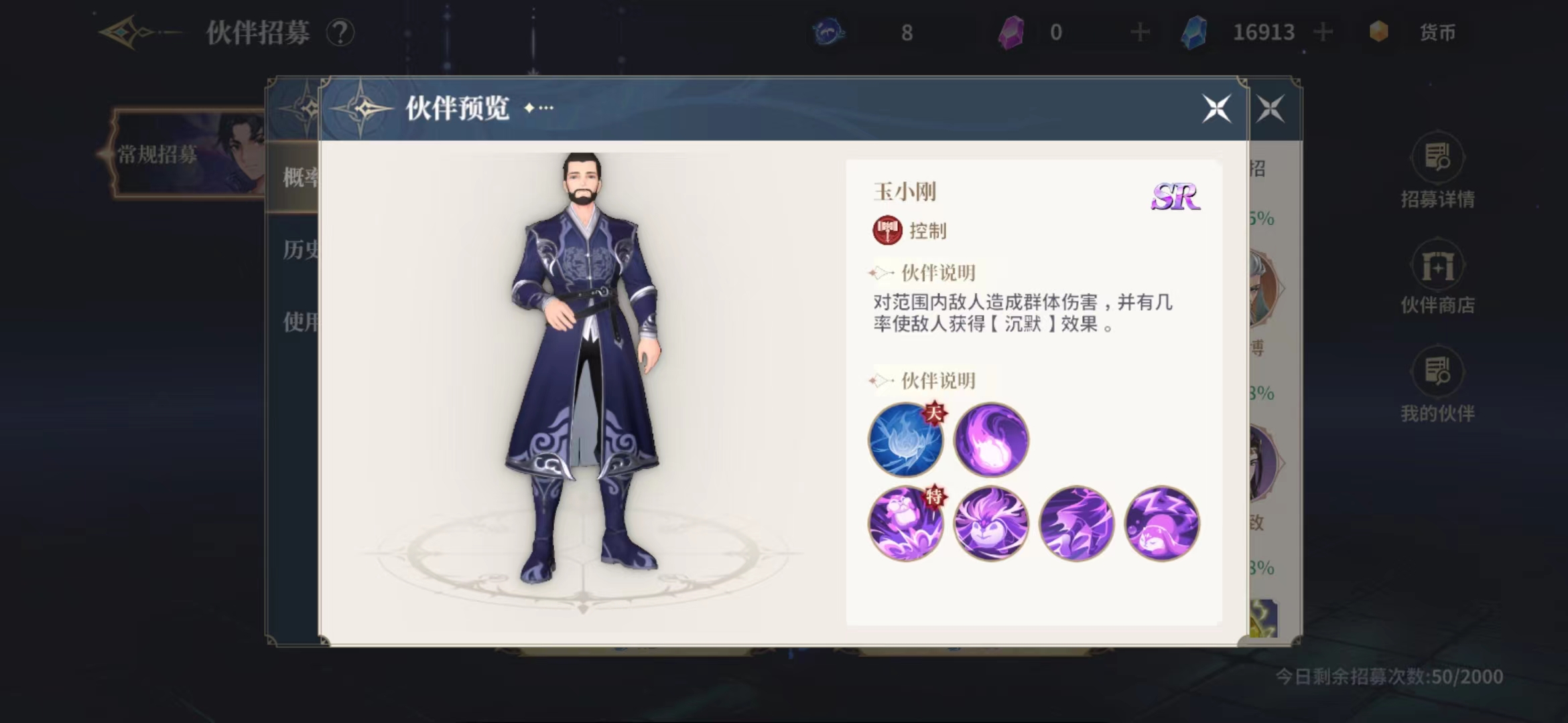 玉小刚是一个比较适合控制位的伙伴,在物理输出上面数值不算高,主要也是带来的群体攻击,但是攻击的数值属实是没有控制效果好用的,本身是带有一个沉默的控制效果可以持续影响对面,在出战天赋上面实际上是可以带来攻击加成的效果,虽然只有3%,但是这个比例也比其他的紫色伙伴出战天赋高一点点,只要玉小刚没有被击杀,玩家身上始终是有3%的攻击提升效果的哦,在普攻上面是带来的一个群体的攻击,攻击数值就是原始的物理攻击,一次可以对8名目标带来伤害。