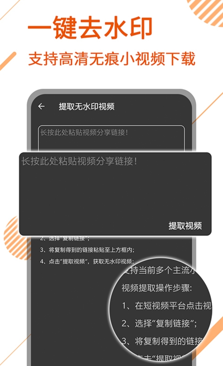 有五大功能。第一,可以提取视频,将喜欢的视频的链接粘贴,就可以提取出来;第二,裁剪尺寸,能自由裁剪视频尺寸;第三,视频压缩,可以调整视频大小;第四,转Gif,视频动图可自由转换;最后一个,就是添加和去除水印了。