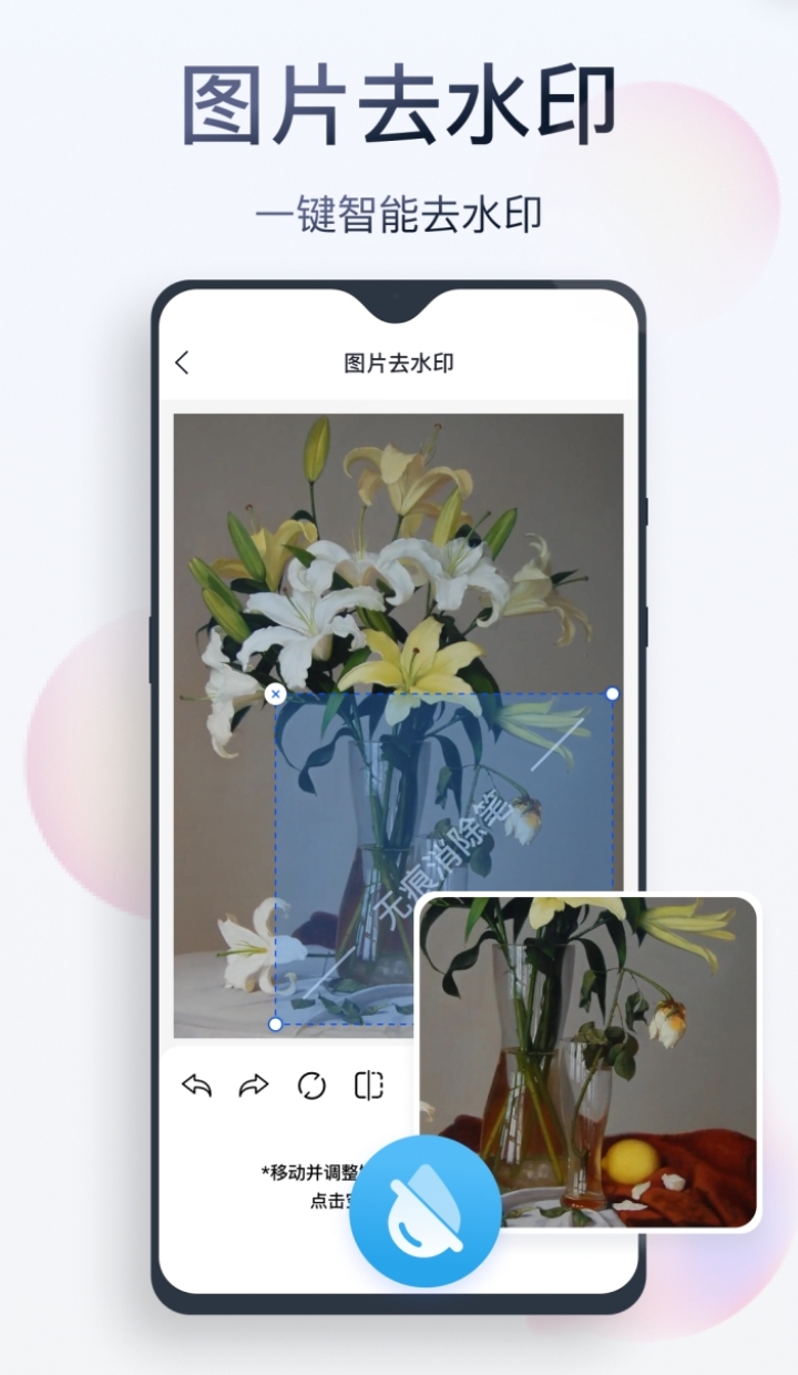 一个能不保留痕迹去除水印的软件,可以将图片中的杂物、文字、符号一一去除,还原图片最开始的样貌。当然,也可以添加水印,软件里还有一些照片装饰材料。