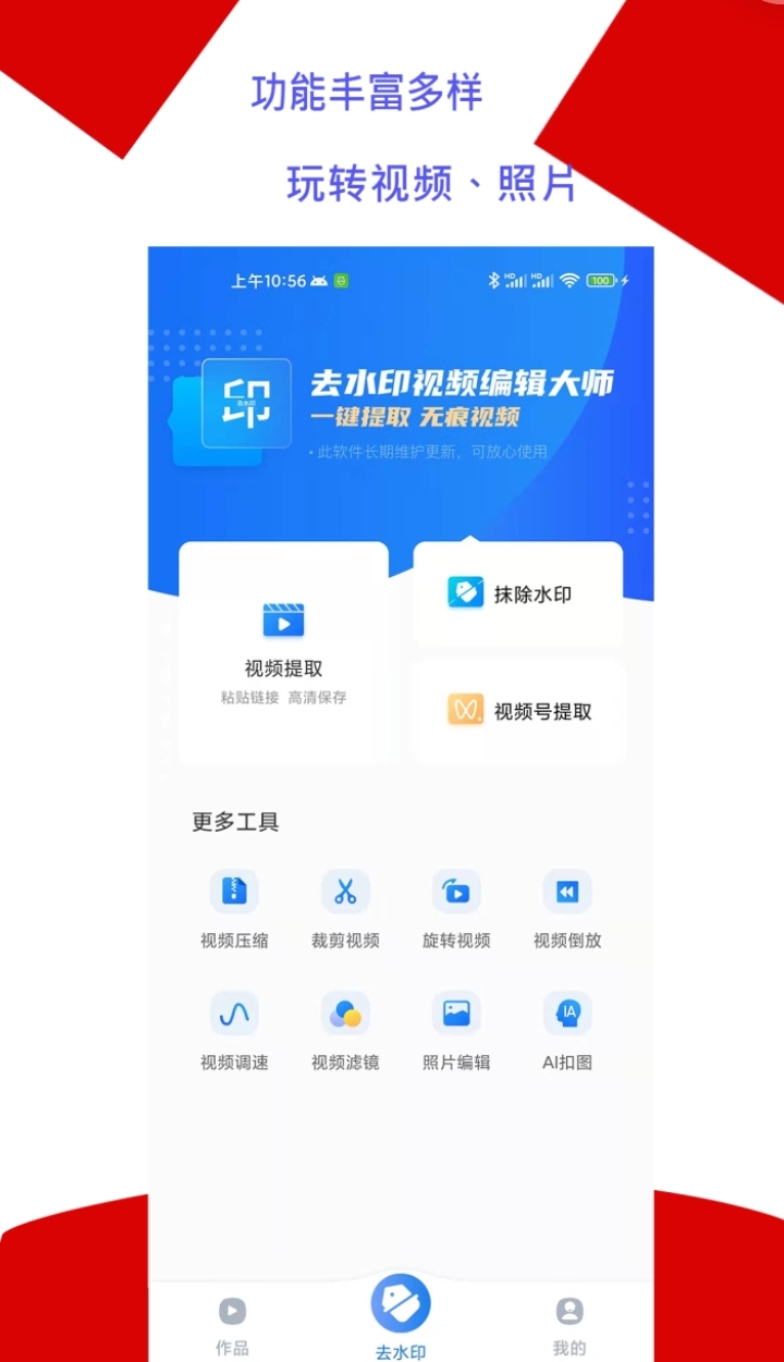 《水印宝》主要为水印相关的功能服务,有多种视频处理方式,除了去水印,想提取原视频,给视频变速,或者美化、裁剪、提取音频等,都可以。而且图片也有一样的功能哦!