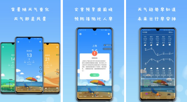 软件上通过背景的变化来实时显示当下的天气情况,在显示天气的同时给用户展现这个天气适合的休闲方式。如果说用户所在地突然出现一些特殊的恶劣天气情况,会及时提醒用户预防措施的推荐,也能在软件上知晓未来的天气趋势。