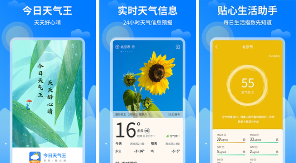 软件上为用户提供每日的天气情况,每天打开软件后还有每天的心情书签,让打开的用户有个好心情。在天气预报页面也会有精美的图片显示,让用户好心情得到延续。除了有今日的天气详情之外还有各种影响空气质量的直属
