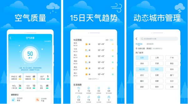 在软件上支持多个城市的天气情况显示,只要在城市管理页面进行多个城市的添加即可。在页面显示上能够提供城市未来15天内精准的天气变化情况,点击每日的天气详情还能了解当日每个小时的天气情况和空气质量情况。