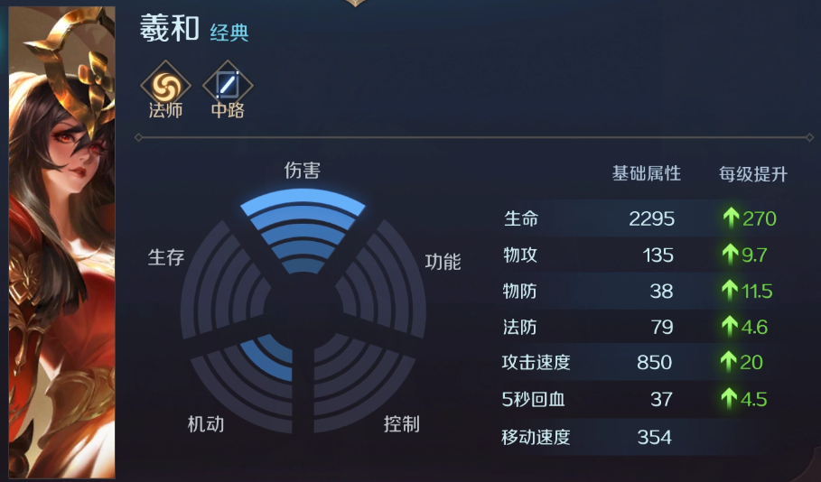 羲和:这是一个机动性不俗的高爆发法师,被动能通过放技能来积蓄能量以此制造火球来追踪敌人,每个火球的伤害都是十分可观的,不过命中同一敌人时会有伤害衰减。