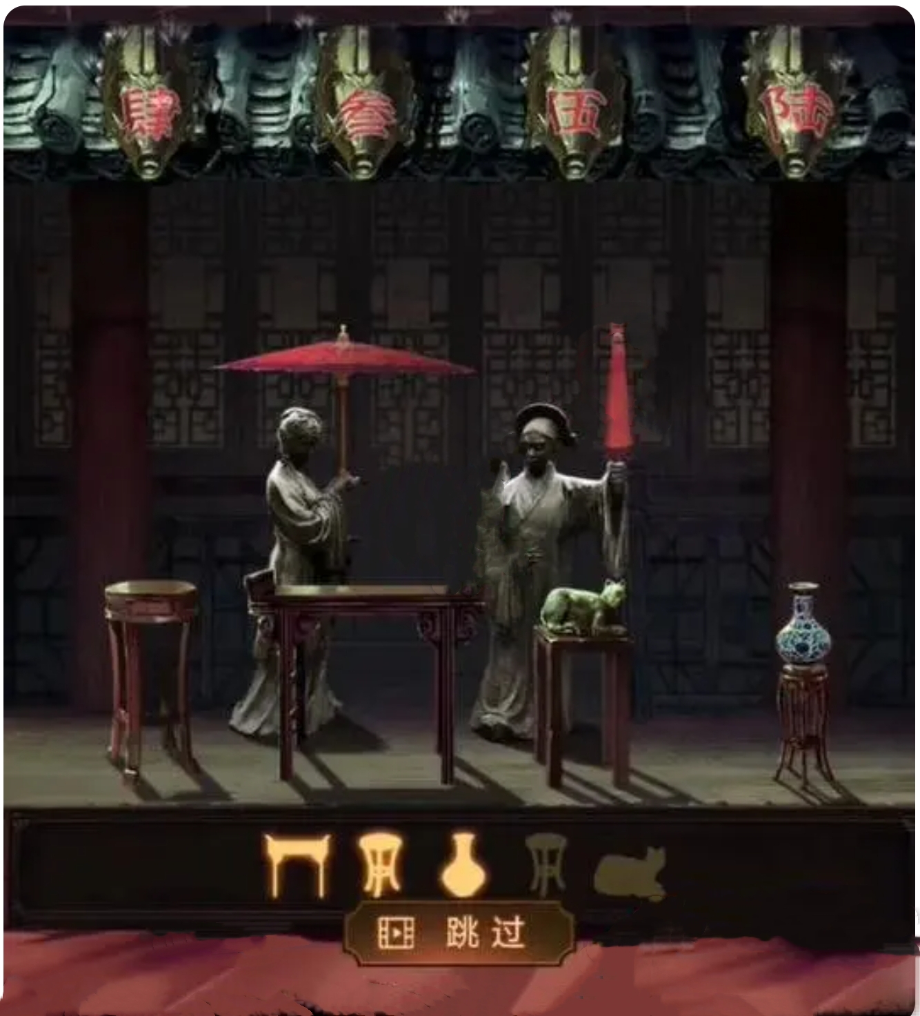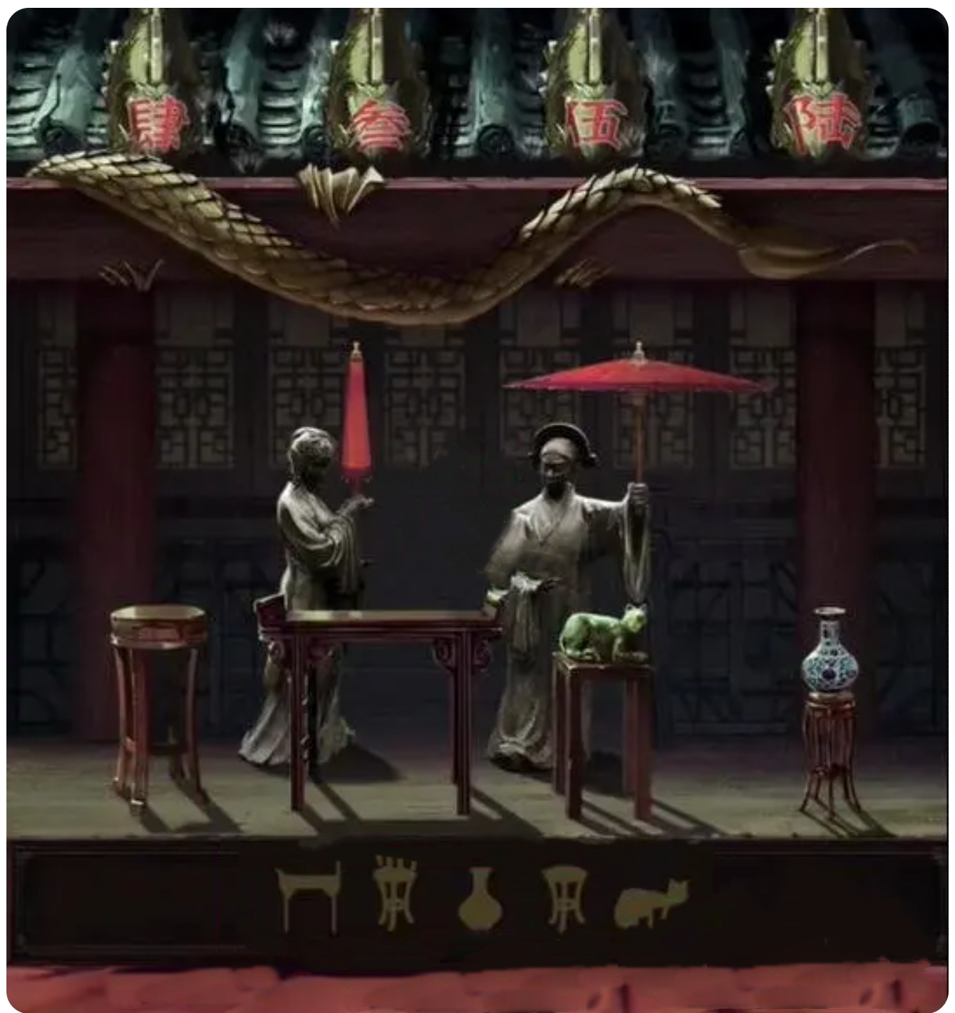 首先玩家们想要获得蝴蝶玉,那么就要先让雨滴落在系统对应的物品上面,进入游戏关卡过后,玩家们会发现屋子的上方有四个龙头,这四个龙头下方站着两个铜人,同人的手中都有伞,这时玩家们要点击上面的龙头,然后按照下方柜子那里出现的文物顺序来解开谜题,解开文物的谜题过后,玩家们要点击左侧同人的雕像,让他把伞给合起来,这时雨滴就可以落在桌子上了,落在桌子上之后会紧接着滴落在左侧的木板凳,这里有一个注意的点就在于右边雕塑的伞是不能够关上的。