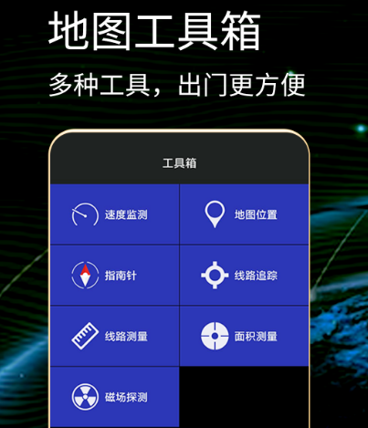 当前各种手机工具箱占据着重要的作用,该app其中有各种特色功能,比如GPS快速定位,可快速了解当前所在的地理位置,另外还能利用指南针指引方向,有很多实用功能,比如经纬水印相机、时间、海拔、天气等,总功能满足人们的一系列需求。其中有多种不同的地图模式,包括标准、卫星、夜视等三种模式可随意切换,除了可了解地图之外,还有各种小工具,包括火车测速仪、汽车测速仪、指南针等。