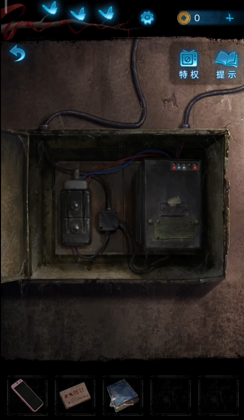 小伙伴们在拿到钥匙之后可以将游戏中的电闸箱打开,将电闸拉起来,这个时候就可以 操纵屏幕返回到游戏中的第二个场景里,场景的地上会有闪烁的灯光线索,玩家需要仔细注意灯光闪烁的次数和颜色,根据线索来获取对应的箱子密码。
