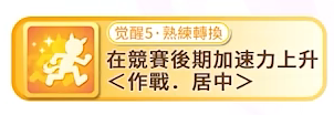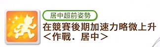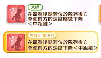 除了束缚和独占力以外,居中超前姿势和熟练转换也是下位和上位的关系,可以看到在上位技能熟练转换的效果描述中也是同样将加速力略微上升直接改成了加速力上升,除此以外,如果你想让这些技能能够正常用处,那么就需要保证自己的角色跑法符合它们的要求,就草上飞而言的话,只需要保持在队伍居中位置就能够触发这些技能。