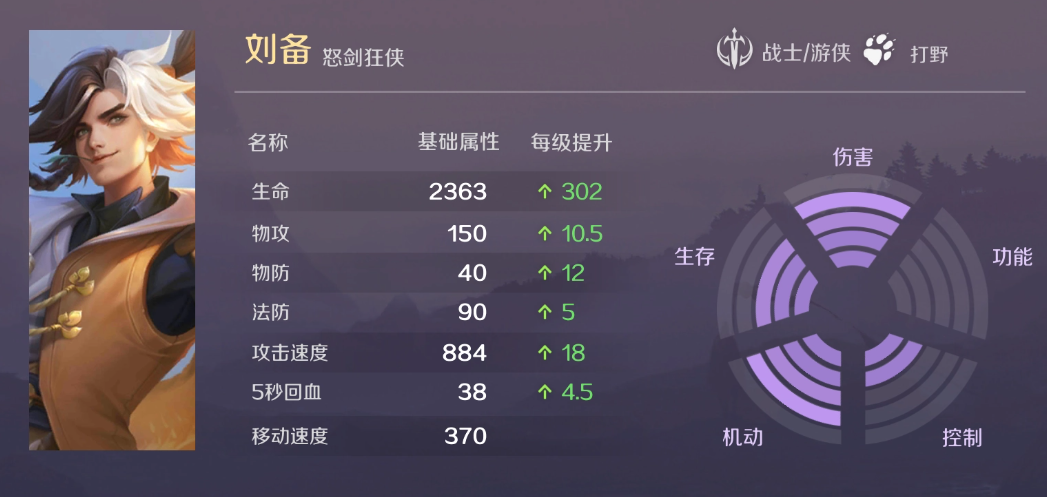 刘备:该英雄的持续输出能力出色,每过两次普攻下次攻击就会造成额外物理伤害并标记目标,主动技能则兼具冲锋,回复,减伤,以及控制效果,而且他的冲锋技能还可以通过触发标记和击杀敌人来进行刷新,所以一个会刷技能的刘备对比胡乱操作的刘备来说,其强度会高出数倍。