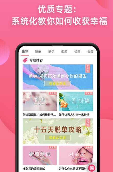 该软件深受一些单身人士的认可,在该软件上能学习到一些恋爱的秘诀,并且还有专业的恋爱专家进行互动,如果年轻人在恋爱中遇到一些不解的事情、或者困惑的时候,专家都会进行答疑解惑的。让你轻轻松松的能够成为恋爱高手,早日和自己的有缘人走到一起。