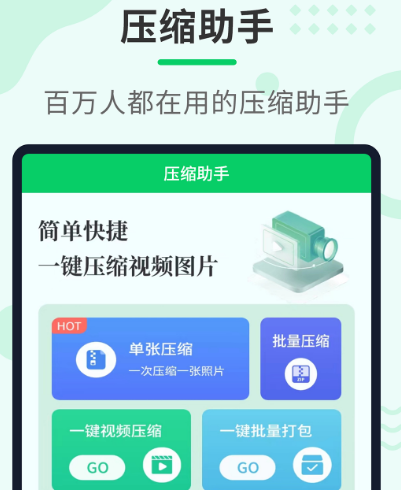 这是全能型压缩助手,在我们的印象当中,每当说到压缩软件肯定会想到文件,因为在人们的印象当中,只有文件可以压缩,其实并不是这样。现在图片和视频是当前比较常见的信息传播方式,也是当下主流方法,现在很多小伙伴手机当中储存的照片图片比较多,对此可利用压缩助手来解决。现在百万人都在使用,一键快速压缩,另外还可添加水印。