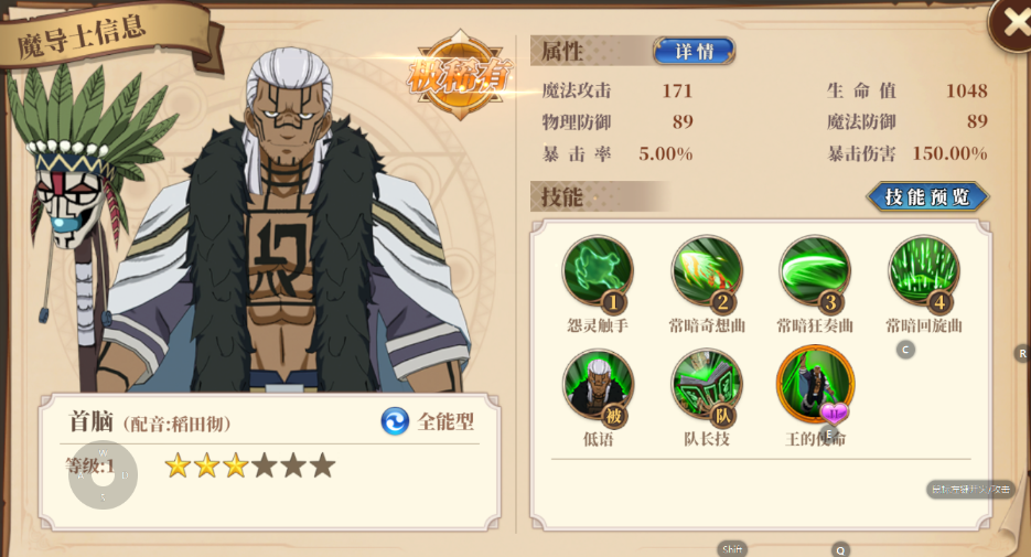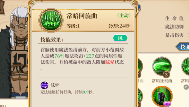 搭配【首脑】主要是因为目前游戏中主要的属性克制是有三个,但是其实还有一个是全能型的角色,这类角色是完全不怕在对战过程中出现克制等情况,算是综合型的,这个角色在动漫中的实力也是非常的惊人的,同样的在实战中的输出技能也是在前期达到了非常不错的表现,自身的攻击属于风属性伤害,而且在强化到三星后,还可以使用【常暗回旋曲】,这个技能在对敌人进行攻击的时候,可以让敌人附加眩晕效果,同时这个眩晕效果是有0.9秒的。控制时间很长,但是由于这个角色获取难度比较大,玩家们如果有【温蒂】或者【露西】的话,可以暂时选择替补一下!