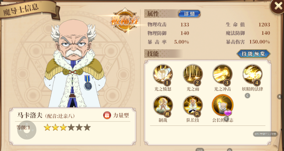 【马卡洛夫】作为这个队伍中最主要的输出,虽然游戏中有不少光属性伤害的角色,但是马卡洛夫注定是特别的,这个角色属性力量型角色,抽取难度较高,可以选择使用同属性【怀特艾】进行替换,马卡洛夫在游戏中,不管是竞技玩法还是副本玩法中都是非常给力的,近战输出的优势可以让队伍搭配中的两个手长的角色有很好的发力空间,同时,自身的技能比较平衡,自身的被动让他上升到了一定高度,在对敌人攻击的时候可以获得一个圣印效果,这个效果可以进行叠加,当马卡洛夫使用技能进行攻击的时候,这个被动就会生效,这个被动效果会在玩家们释放【妖精的法律】时,伤害增加20%,效果是非常不错的!