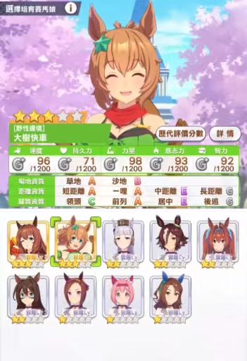 首先玩家们要知道的是大树快车在这款游戏当中初始就是一名三星级别的角色,这也奠定了她强大的实力基础,从官方给出的面板数据来看,她的速度值是比较高的,可以达到96,而力量则是最高可以到达98,毅力93,智力92,体力71,所有的面板数据大部分都超过了90,这也意味着她是一个强悍的赛马娘,同时也能看出来她的体力是她的弱点之一,玩家们想要培育她,那么推荐将她的速度和智力进行培育,因为速度和智力是有额外加成的,速度是额外加成20%,智力是额外加成10%,而在赛场的适应性方面她是达到了a级,沙场则是b级,短距离比赛她也是a级,这也就意味着她在游戏当中擅长的是短距离比赛。