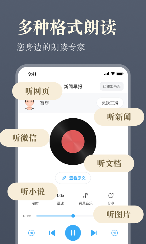 软件界面精简,支持辅助阅读,通过不同AI主播朗读各种效果,从而极简听书。它一键导入不同格式本地文件,实时畅听内容,个性化设置语速、背景音乐、音量大小等。