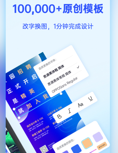 无论想要展现产品还是想要印刷,海报都可在这款软件中完成,具有简单易懂的在线编辑模式,可一键生成将高清的图片保存在手机中,即便没有任何设计经验,也没有设计灵感,也不需担心,只要点击一键生成即可结合个人实际需求快速打造出专业又非常吸引人的海报及图册。可在照片上添加文字,所有字体不需开通会员都可使用,没有任何版权烦恼。