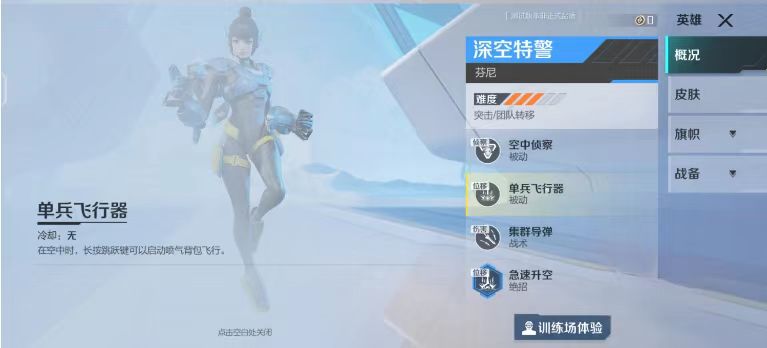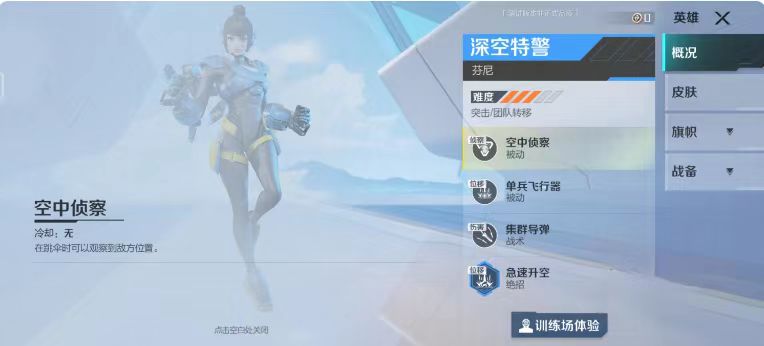 再来了解一下他的被动技能,他在游戏当中一共拥有着两个不一样的被动技能,第一个被动技能名字叫做空中侦察,在游戏刚刚开局时,所有玩家都需要经过跳伞落到指定位置,而他在跳伞当中是可以侦查到敌方目前所在位置的,无论是否隐藏都能被他看见,第二个被动技能则是可以长按跳跃的按钮,这时会启动他自身的喷气背包,使用这个背包之后他就可以进行飞行了。