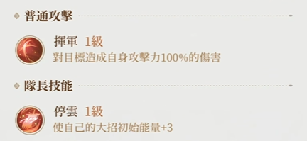 普攻是“挥军”,效果与多数角色一样都是百分百攻击的单体伤害,但动作这块会表现的更加儒雅,而他的队长技能反而会更加实用,因为可以直接令自己的大招初始能量 3,这就意味着他可以先一步放出大招,要知道他的大招可是有增伤效果的,先手打出之后后续的增幅会非常可观。