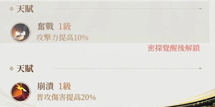 在觉醒之后的天赋则是“奋战”,其实很多输出型角色的觉醒天赋都是它,但陆逊并不会因为它的烂大街而表现出任何不契合的情况,相反陆逊不论是普攻还是大招都是十分吃它那10%的攻击加成的,有了这些加成之后陆逊的整体伤害会更进一步,不过需要注意的是该天赋可以升级,所以建议还是多多升级以此提升攻击加成的幅度。