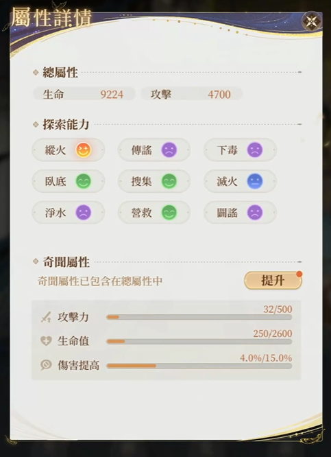 奇闻属性的话,和其他很多输出型角色一样照例增加了攻击,生命和伤害加成这三项,应用在实战中就是更高的爆发和持续伤害,敌人的脆皮在看到他的时候基本都会心生畏惧。