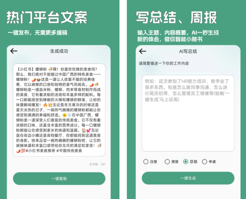 搭载新型的AI语言模型,有较为强大的中文语境语言处理能力,帮用户写文章、聊天、得到灵感与启发,提升创造力。软件有特色的热门平台文案,根据微博、小红书发帖习惯写营销文案,而且生成不限字数,写长文短文都适用。