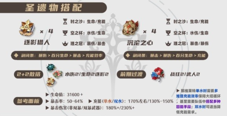 那维莱特最优秀的圣遗物套装是逐影猎人四件套,这个个效果可以根据生命值变化提高暴击率和暴击伤害,非常适合那维莱特的重击玩法。由于那维莱特在重击的时候会使用一部分自身血量,而在吸收源水之滴时会回复生命值,这样就可以频繁触发逐影猎人的效果,大幅提升输出。如果你没有刷出好的逐影猎人套装,你也可以选择沉沦之心两件套和花海甘露之光作为过渡,这样可以增加hp和水伤加成。