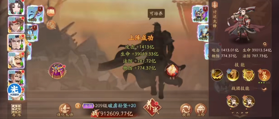 而核心角色其实除了这几个之外,还可以多关注一下庞统,这个角色自带了一个回怒的效果,所以在输出数值上面还是很高的,而且大家在上面也是可以激活一定的抗性,这样搭配的防御也还可以,但是根据血量来看这个阵容非要走后期的话还是有点危险的,想要效果更持续的话其实大家也可以将上面的角色替换一个更有生存能力的角色。