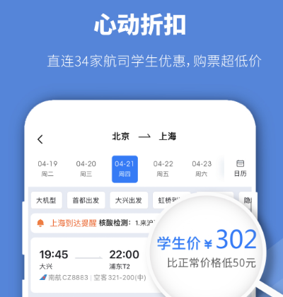要专门为学生打造的机票订购平台,学生可在这里享受更多的服务,无论是中学生还是大学生,都可享受足够的优惠。在这里购买机票要比正常价格更便宜一些,其中整合全网折扣信息,帮助大学生降低往返机票的费用,让大家在出行时更加自由。
