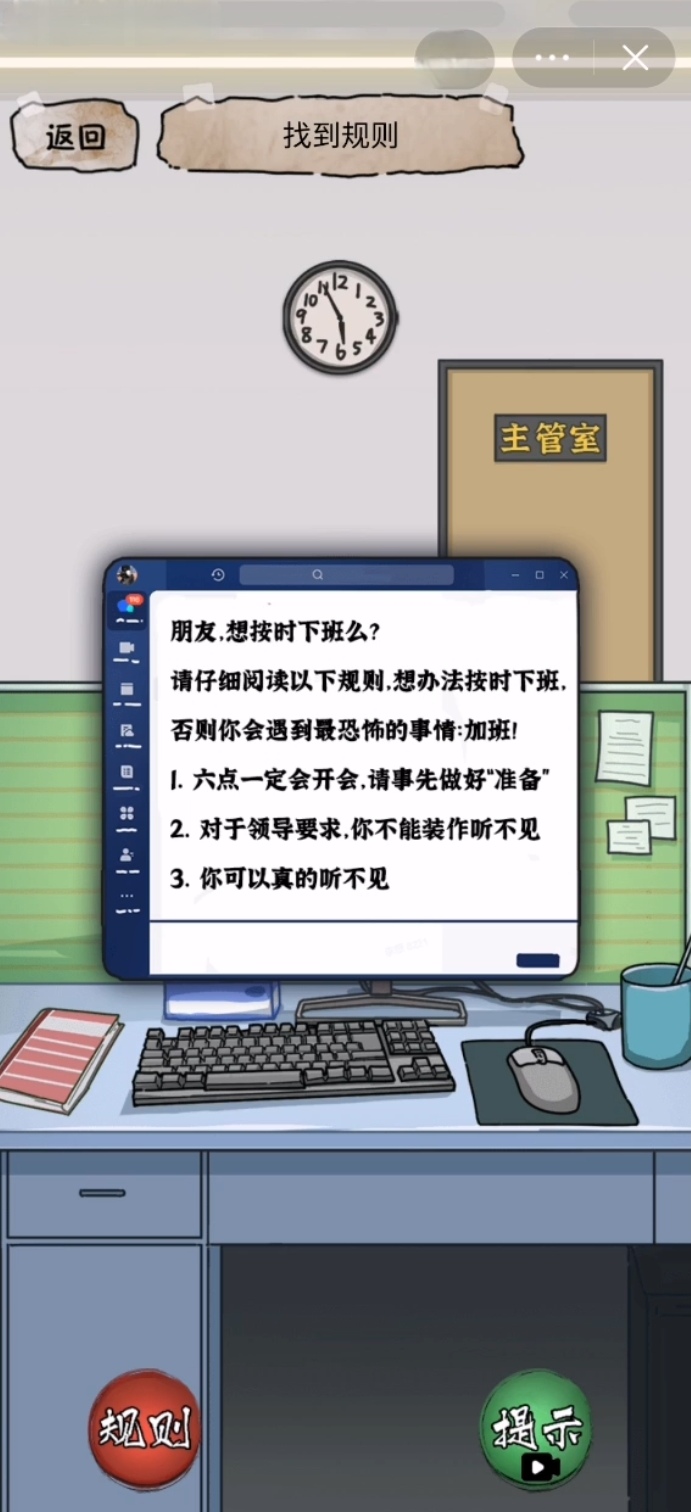 下班是游戏当中的一个关卡之一,但是有不少新手玩家在这一关当中都泛起了难,接下来就为大家讲解一下想要通过这一关卡需要注意的事项和步骤吧,首先玩家们要进入到关卡当中会看见游戏画面有一台电脑,根据电脑上面提示的信息是可以获取到这一关的过关规则的,获取过关规则之后再点击桌子当中的抽屉,抽屉当中会有耳机,点击时间会出现一个选项,在这里的选项玩家们要选择憋着,最后再来看到电脑桌旁边贴着的三张纸条这些纸条上面也是有着关卡规则的。