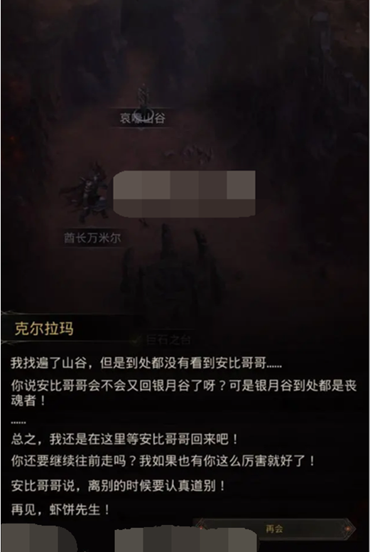 根据最后的谈话内容知道克尔拉玛要去【哀嚎山谷】找安比,而玩家也要去【哀嚎山谷】的银月谷,所以下一步就去银月谷哦,不过是单独前往的。玩家在【哀嚎山谷】碰见了安比,然而安比已经变成了怪物,看见谁就攻击谁,所以玩家就要使用技能攻击安比,杀死安比后就可领取狮厅的钥匙了,但克尔拉玛被变成怪物的安比杀害了,算是一种额外的解脱吧,不会饿肚子了。