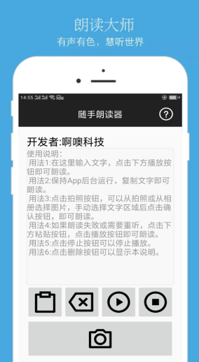 在软件对应位置输入或者是粘贴文字之后直接点击下方的播放按钮就可以进行朗读转化,更是带有拍照识别朗读的功能。不止如此,软件还支持后台启动,复制文字段落选择朗读就可以播放。