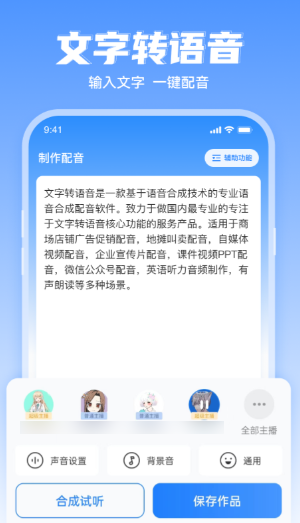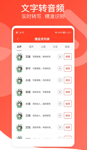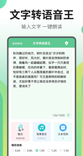 带有海量的不同播音员可以自由选择下载,软件能够实现对文字的智能朗读播报,更是加入了转写功能,将附近的人声智能识别转化为文字,简单易用。