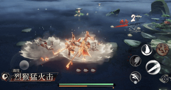技能二叫做炽火旋棒影,小悟空会以旋转的方式不断向前,突进之后会突然跃起,变成一个超级大的金箍棒狠狠砸向敌人。在二技能发起之后,小悟空就会出现霸体的效果,不过在竞技模式当中并不会出现此效果。之后小悟空会再次将金箍棒扔到空中,把握时机会,从空中直接旋转,向敌人进行多次攻击,如果分身在场,那么就可以随着本身一起释放。