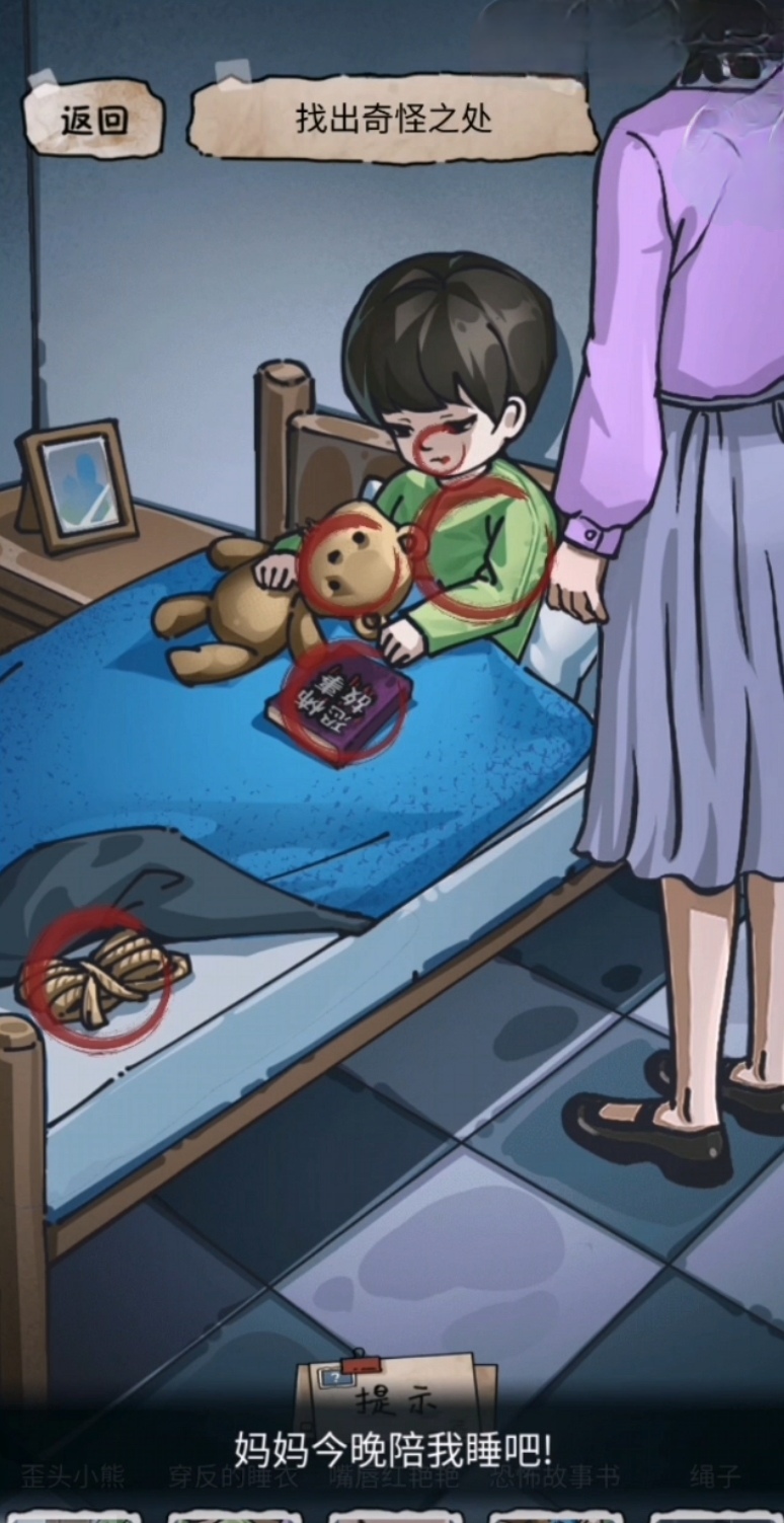 在这一关卡当中比较考验的就是玩家们的洞察能力了,想要寻找到真正的孩子就需要不断的寻找游戏当中给出的线索,不少新手玩家却根本找不到真正的线索到底在哪里,接下来小编就来为大家好好讲解一下,首先玩家们来到这一关卡当中看见的第一个画面是一个靠在床边上的熊孩子,在这里需要玩家们找出图片当中奇怪的地方,第一个奇怪的地方就是孩子身上穿反了的睡衣以及他嘴角红色的血迹,还有套放在床被子上的恐怖故事书以及被子下面隐隐约约藏着的绳子还有被扯烂的小熊,这些都是第一个画面的奇怪之处。
