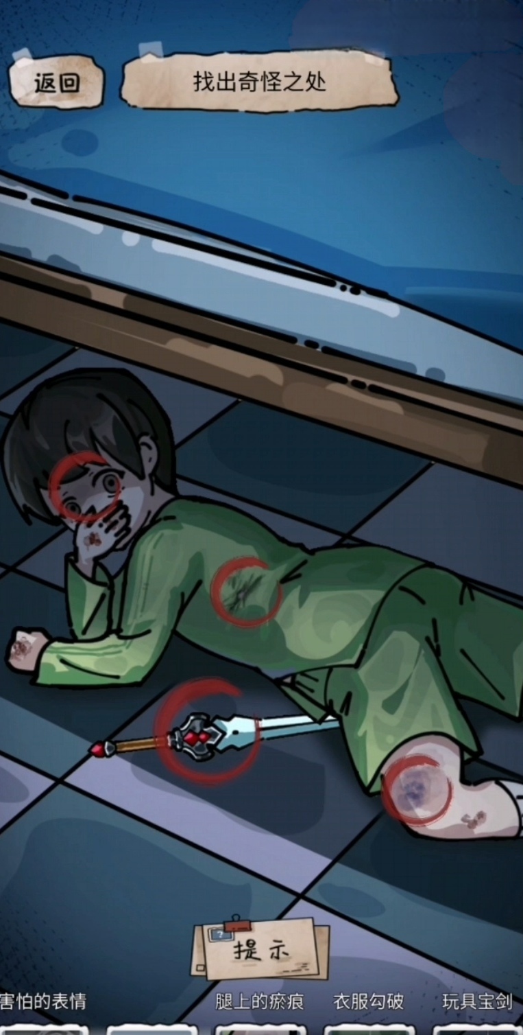 再然后玩家们来到第二个画面,会发现第二个画面下的孩子全身都是伤口在这里也是要寻找到他的不对劲的地方,他在这里不对劲的地方是脸上害怕的神情以及手腕处红色的血迹还有腿上的淤青以及破破烂烂的衣服,还有最后一个就是被压在身下的宝剑。