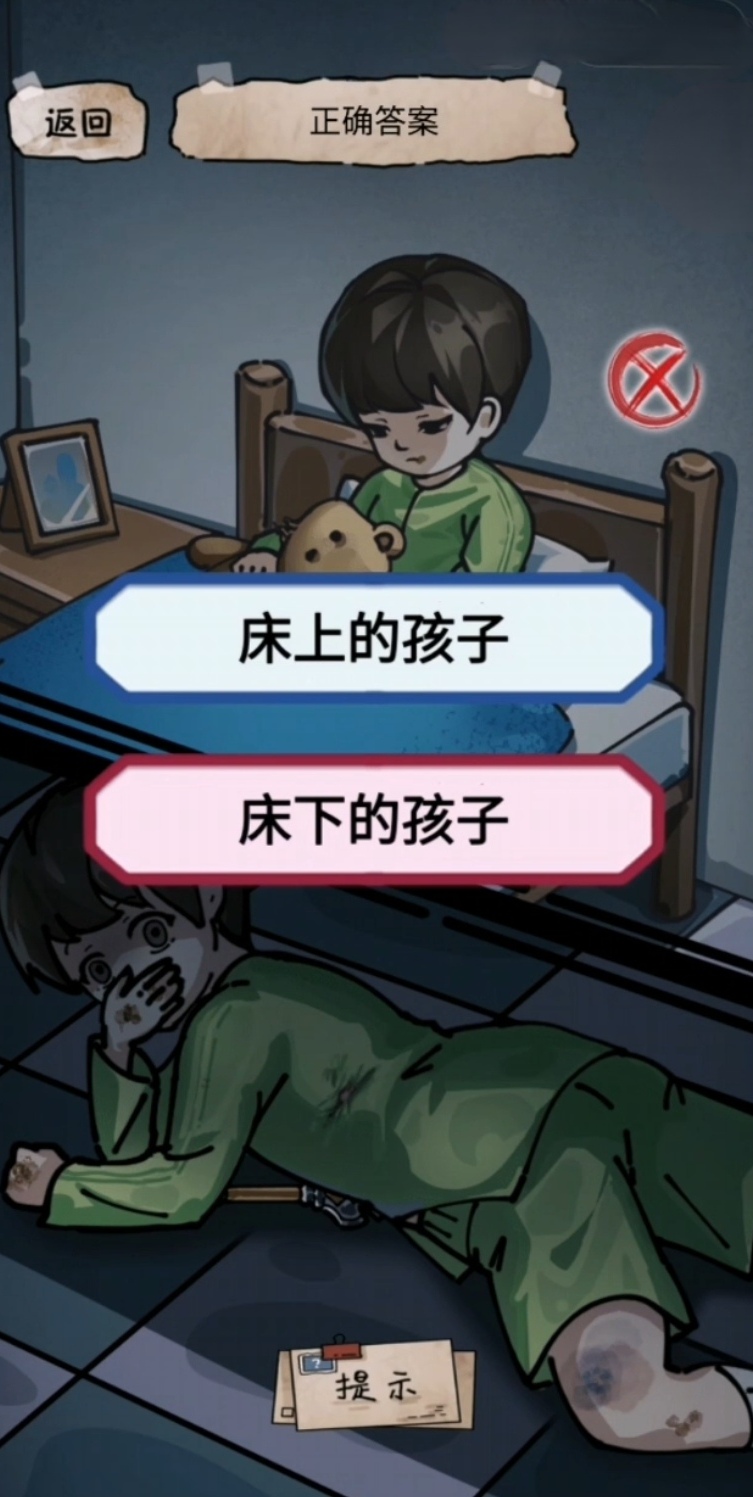 能找到以上两个不对劲画面的所有东西之后会出现两个选项,一个是床上的孩子一个是床下的孩子,这两个选项只需要玩家什么选项都不选,叉掉选项之后再去点击桌子上的照片,这样的话这一关卡才算是顺利成功通过,可能不少玩家都在疑惑这样设置,那么无论选择哪个答案都不能过关吗?其实这就是这款游戏的特别之处了,所以每一个选项以及背景故事都出乎玩家们的意料。