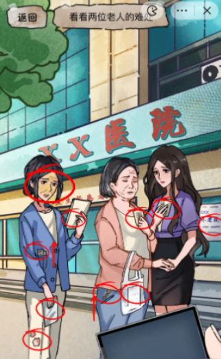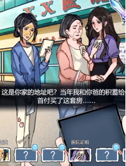 先得观察下两位老人的身体和周围的环境,发现他们隐藏的线索。你可以点击他们手中或身上的物品,或者上滑他们的衣服口袋,看看有没有什么可疑的东西。在左边的母亲那里,你可以发现以下线索:她手中拿着父亲的手术单,说明父亲需要进行一次昂贵的手术。脸色苍白,眼神无神,说明她身体不好,可能也需要治疗。左手上有一个记事本,上面写着给你买房子的地址,说明她很关心你的生活。裤子上有一个破洞,说明她生活困难,没有钱买新衣服。如果你上滑她衣服口袋,你会发现两张火车票,说明她打算带着父亲去别的地方治病。